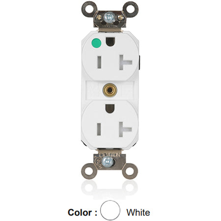 Leviton MT830-ILW, Lev-Lok Straight Blade Duplex Receptacle, Extra Heavy-Duty Hospital Grade, Tamper-Resistant, Illuminated, Smooth Face, 20A 125V, NEMA 5-20R, 2-Pole, 3-Wire, Modular Terminals, Nickel-Plated Brass Strap, White
