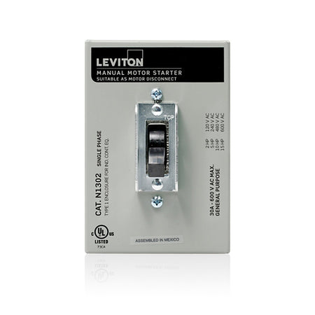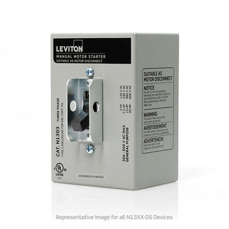 Leviton N1302-DS, Double-Pole AC Manual Motor Controller Enclosed Switch, Suitable as Motor Disconnect, Standard Toggle, Industrial Grade, 30 Amp, 600 Volt, Type 1 Metal Enclosure, Back & Side Wired, Gray