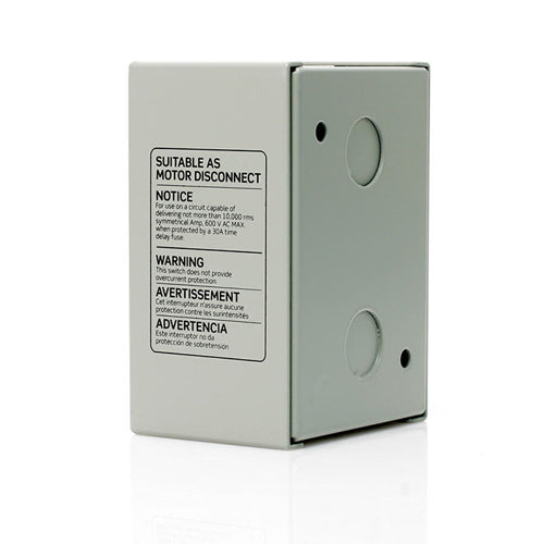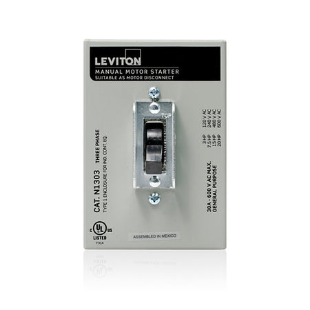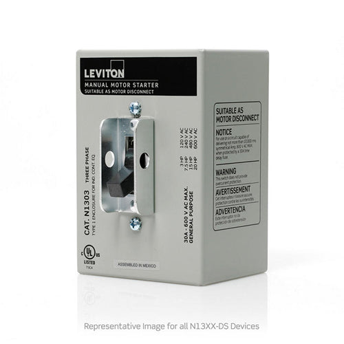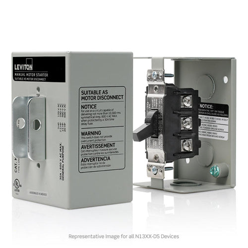 Leviton N1303-DS, Three-Pole AC Manual Motor Controller Enclosed Switch, Suitable as Motor Disconnect, Standard Toggle, Industrial Grade, 30 Amp, 600 Volt, Type 1 Metal Enclosure, Back & Side Wired, Gray