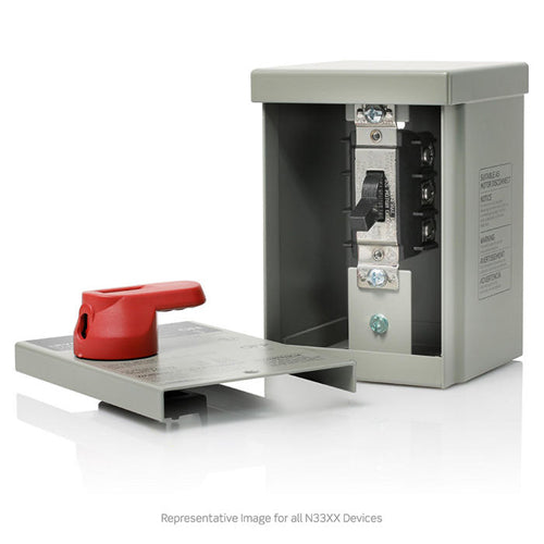 Leviton N3303-DS, Three-Pole AC Manual Motor Controller Enclosed Switch, Suitable as Motor Disconnect, Pistol Grip Toggle, Industrial Grade, 30 Amp, 600 Volt, Type 3R Metal Enclosure, Back & Side Wired, Gray