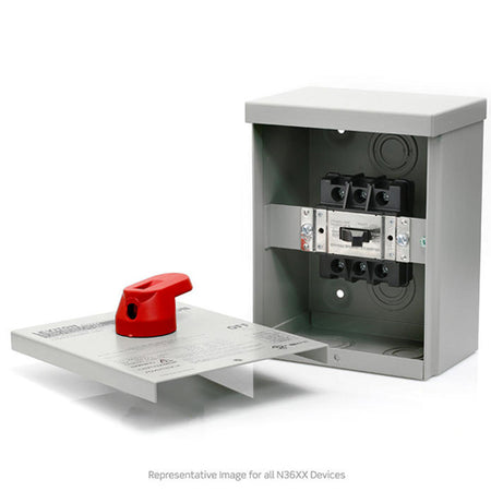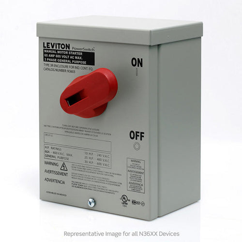 Leviton N3603, Three-Pole AC Manual Motor Controller Enclosed Switch, Pistol Grip Toggle, Industrial Grade, 60 Amp, 600 Volt, Type 3R Metal Enclosure, Non-Grounding, Front Wired, Gray
