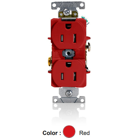 Leviton T5262-R, Tamper-Resistant Standard Straight Blade Duplex Receptacle, Heavy-Duty Industrial Specification Grade, Smooth Face, 15A 125V, NEMA 5-15R, 2-Pole, 3-Wire, Self-Grounding, Back and Side Wire, Red