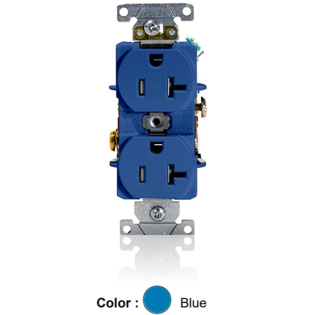 Leviton T5362-BU, Tamper-Resistant Standard Straight Blade Duplex Receptacle, Heavy-Duty Industrial Specification Grade, Smooth Face, 20A 125V, NEMA 5-20R, 2-Pole, 3-Wire, Self-Grounding, Back and Side Wire, Blue