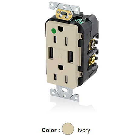 Leviton T5632-HGI, 18W (3.6A) Dual Type A USB In-Wall Charger with Duplex Tamper-Resistant Receptacle, Heavy-Duty Hospital Grade, Smooth Face, 15A 125V, NEMA 5-15R, 2-Pole, 3-Wire, Self-Grounding, Ivory