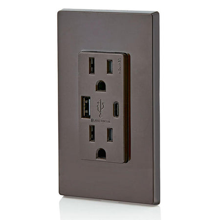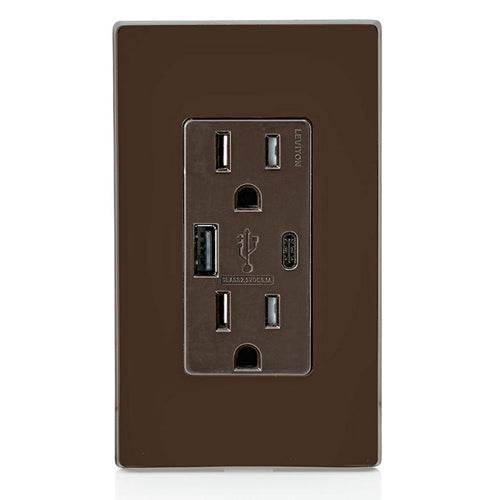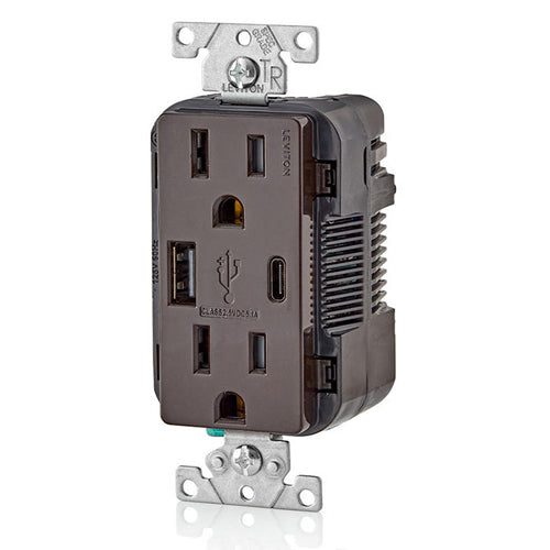 Leviton T5633-B, 25+W (5.1 A) Dual Type A/C USB In-Wall Charger with Duplex Tamper-Resistant Receptacle, 15A 125V, Grounding, Back & Side Wired, Brown