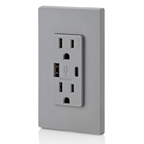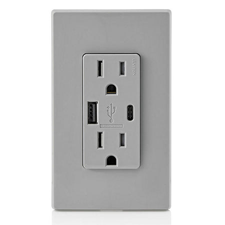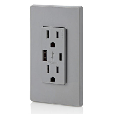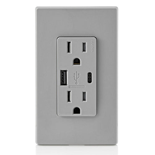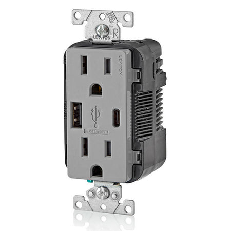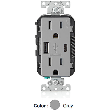 Leviton T5633-GY, 25+W (5.1 A) Dual Type A/C USB In-Wall Charger with Duplex Tamper-Resistant Receptacle, 15A 125V, Grounding, Back & Side Wired, Gray