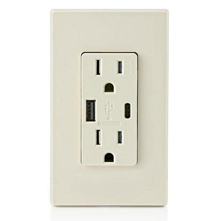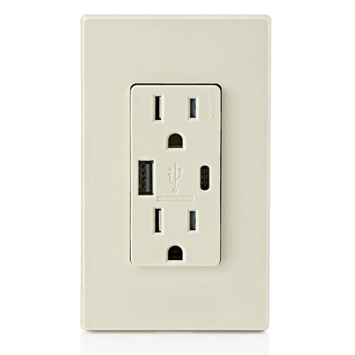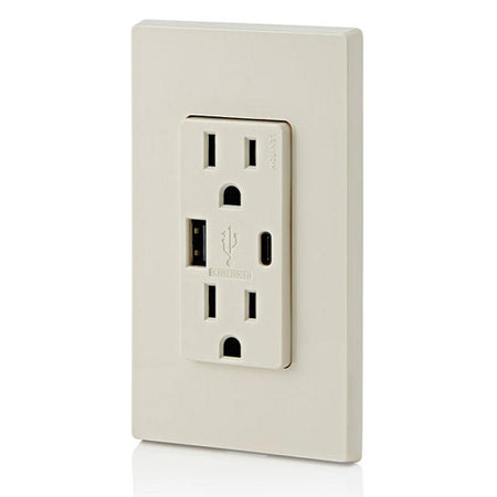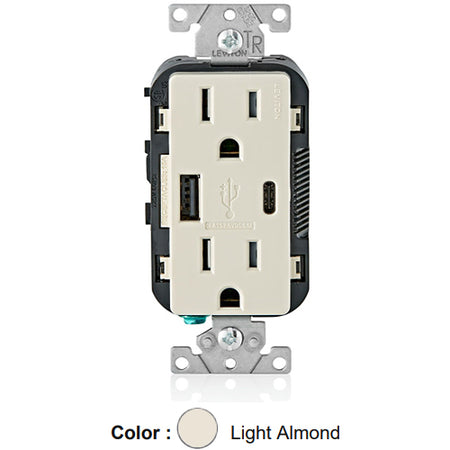 Leviton T5633-T, 25+W (5.1 A) Dual Type A/C USB In-Wall Charger with Duplex Tamper-Resistant Receptacle, 15A 125V, Grounding, Back & Side Wired, Light Almond