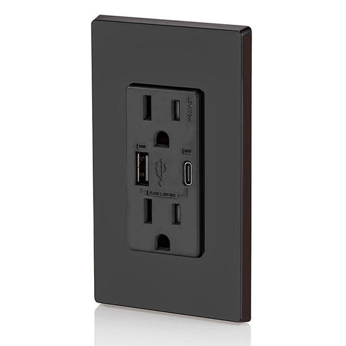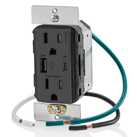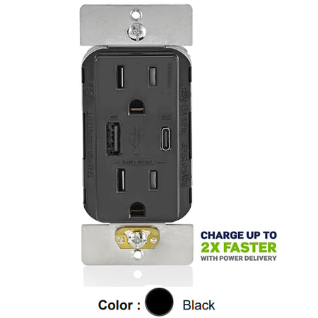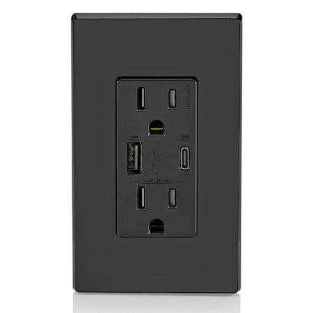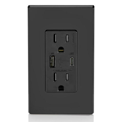 Leviton T5634-E, 60W (20V@2.5A+ 5V@2A) Dual Type A/C USB Power Delivery (PD) In-Wall Charger with Duplex Tamper-Resistant Receptacle, 15A 125V, Grounding, Wire Leads, Black