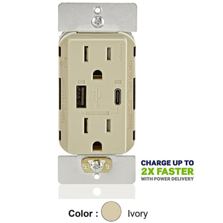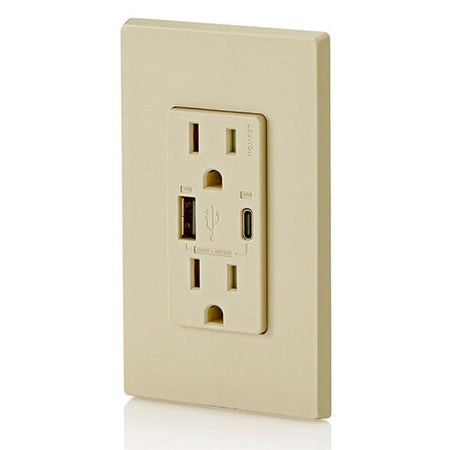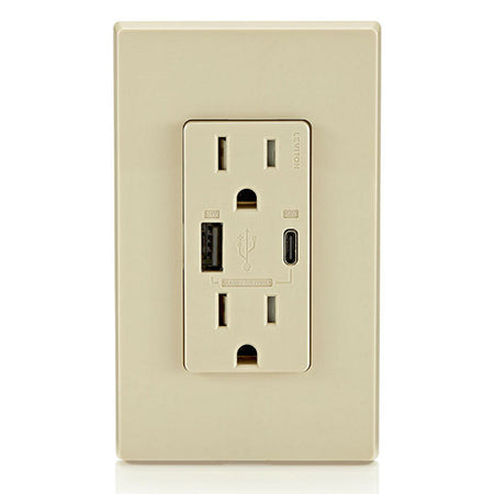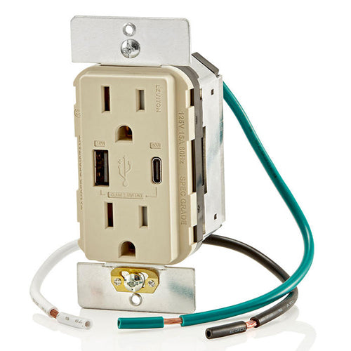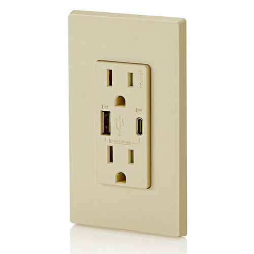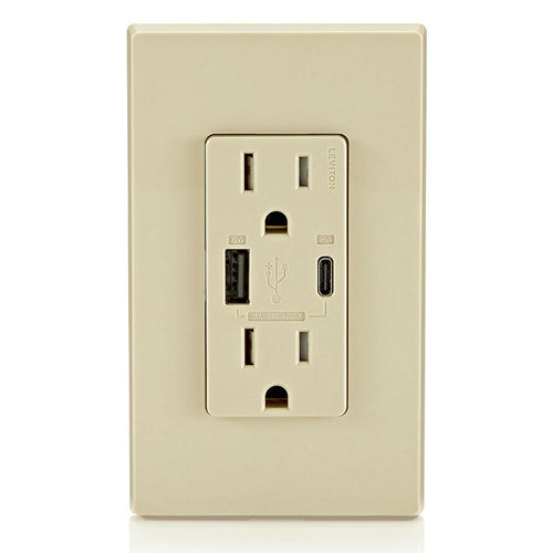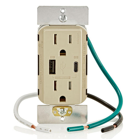 Leviton T5634-I, 60W (20V@2.5A+ 5V@2A) Dual Type A/C USB Power Delivery (PD) In-Wall Charger with Duplex Tamper-Resistant Receptacle, 15A 125V, Grounding, Wire Leads, Ivory