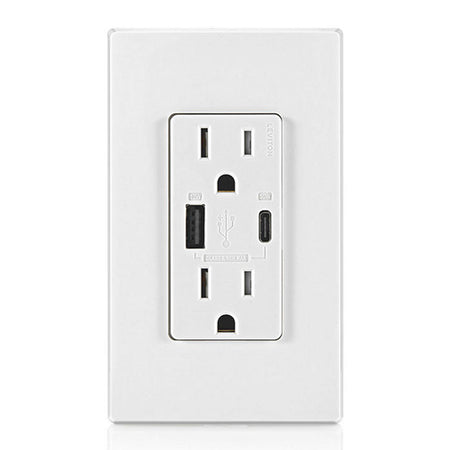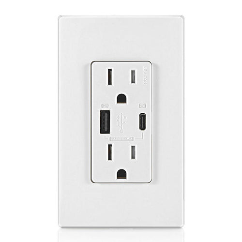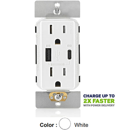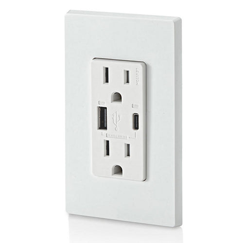 Leviton T5634-W, 60W (20V@2.5A+ 5V@2A) Dual Type A/C USB Power Delivery (PD) In-Wall Charger with Duplex Tamper-Resistant Receptacle, 15A 125V, Grounding, Wire Leads, White