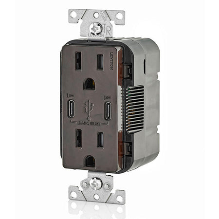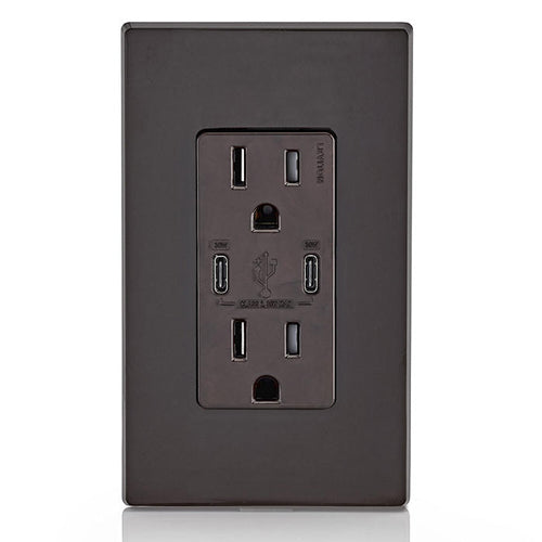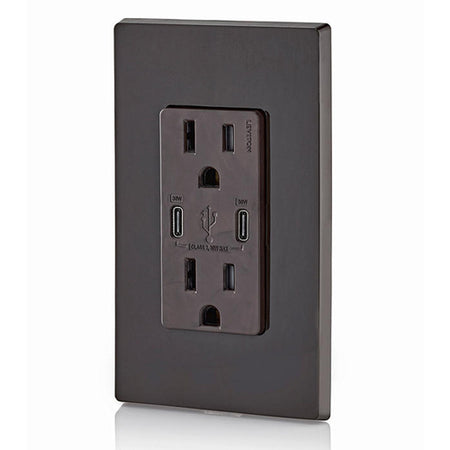 Leviton T5635-B, 30W (6A) Dual Type-C USB Power Delivery (PD) In-Wall Charger with Duplex Tamper-Resistant Receptacle, 15A 125V, Grounding, Back & Side Wired, Brown
