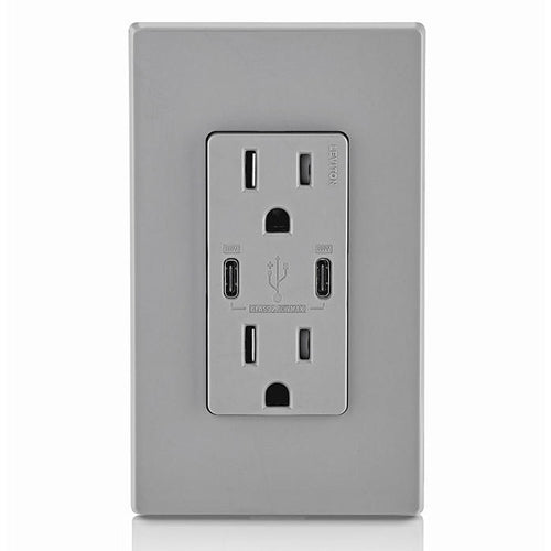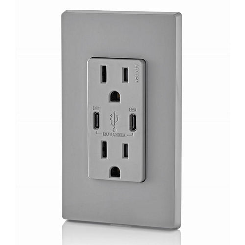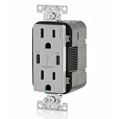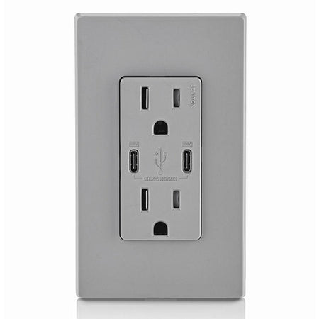 Leviton T5635-G, 30W (6A) Dual Type-C USB Power Delivery (PD) In-Wall Charger with Duplex Tamper-Resistant Receptacle, 15A 125V, Grounding, Back & Side Wired, Gray