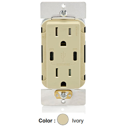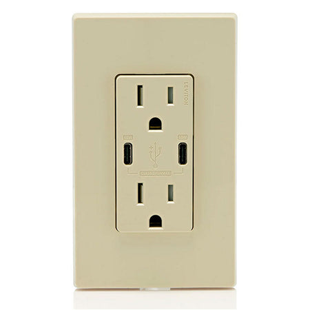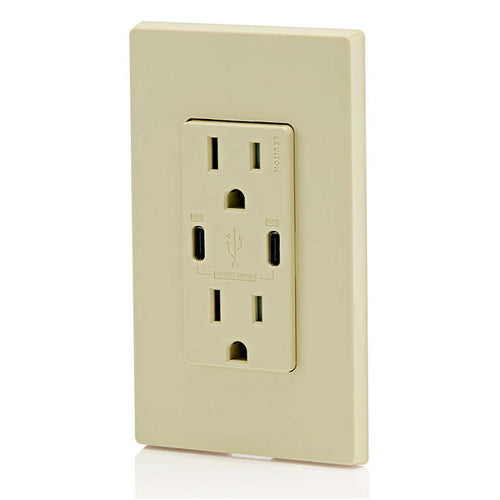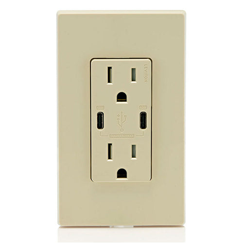 Leviton T5636-I, 60W (6A) Dual Type-C USB Power Delivery (PD) In-Wall Charger with Duplex Tamper-Resistant Receptacle, 15A 125V, Ivory