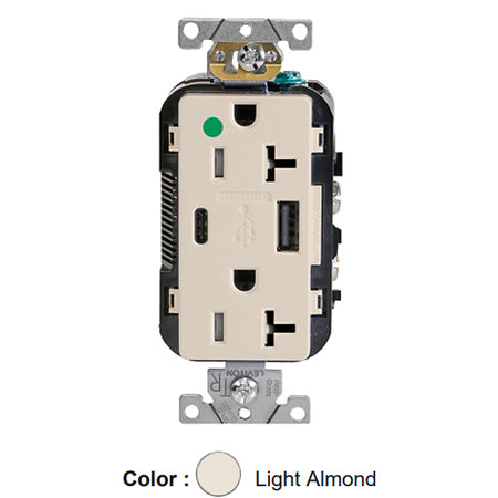 Leviton T5833-HGT, Decora Plus Straight Blade Duplex Receptacle with USB, Heavy-Duty Hospital Grade, One Type A & One Type C USB Port (5.1 Amp), Smooth Face, Tamper-Resistant, 20A 125V, NEMA 5-20R, 2-Pole, 3-Wire, Light Almond
