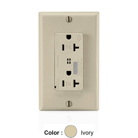 Leviton T7380-I, Decora Plus Surge Protective Duplex Receptacle, Commercial Specification Grade, Tamper-Resistant, Audible Alarm, Indicator Light, 20A 125V, NEMA 5-20R, 2-Pole, 3-Wire, Back and Side Wire, Ivory