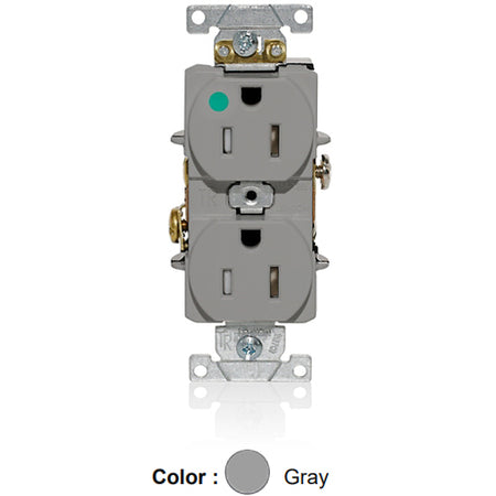 Leviton T8200-GY, Tamper-Resistant Standard Straight Blade Duplex Receptacle, Heavy-Duty Hospital Grade, Smooth Face, 15A 125V, NEMA 5-15R, 2-Pole, 3-Wire, Back and Side Wire, Gray