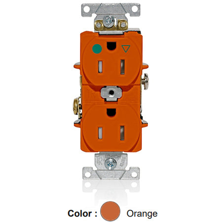 Leviton T8200-IG, Tamper-Resistant Standard Straight Blade Duplex Receptacle, Heavy-Duty Hospital Grade, Smooth Face, Isolated Ground, 15A 125V, NEMA 5-15R, 2-Pole, 3-Wire, Back and Side Wire, Orange