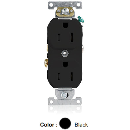 Leviton TBR15-E, Tamper-Resistant Standard Straight Blade Duplex Receptacle, Commercial Specification Grade, Smooth Face, 15A 125V, NEMA 5-15R, 2-Pole, 3-Wire, Self-Grounding, Back and Side Wire, Black