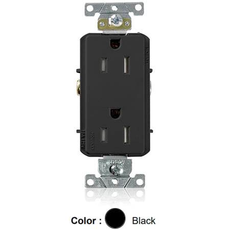 Leviton TDR15-E, Decora Plus Straight Blade Duplex Receptacle, Heavy-Duty Industrial Specification Grade, Tamper-Resistant, Smooth Face, 15A 125V, NEMA 5-15R, 2-Pole, 3-Wire, Back and Side Wire, Black