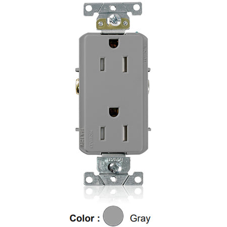 Leviton TDR15-GY, Decora Plus Straight Blade Duplex Receptacle, Heavy-Duty Industrial Specification Grade, Tamper-Resistant, Smooth Face, 15A 125V, NEMA 5-15R, 2-Pole, 3-Wire, Back and Side Wire, Gray