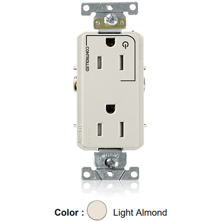 Leviton TDR15-S1T, Decora Plus Straight Blade Duplex Receptacle, Heavy-Duty Industrial Specification Grade, Split-Circuit, One Outlet Marked ''Controlled'', Smooth Face, Tamper-Resistant, 15A 125V, NEMA 5-15R, 2-Pole, 3-Wire, Light Almond