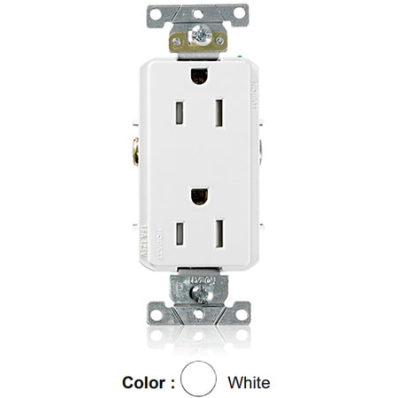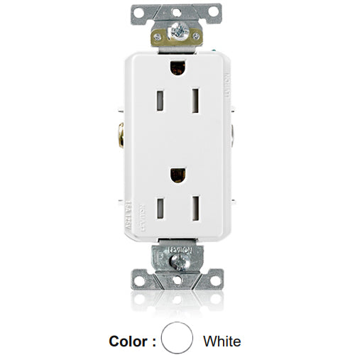 Leviton TDR15-W, Decora Plus Straight Blade Duplex Receptacle, Heavy-Duty Industrial Specification Grade, Tamper-Resistant, Smooth Face, 15A 125V, NEMA 5-15R, 2-Pole, 3-Wire, Back and Side Wire, White