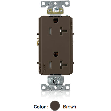 Leviton TDR20, Decora Plus Straight Blade Duplex Receptacle, Heavy-Duty Industrial Specification Grade, Tamper-Resistant, Smooth Face, 20A 125V, NEMA 5-20R, 2-Pole, 3-Wire, Back and Side Wire, Brown