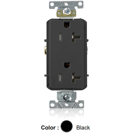 Leviton TDR20-E, Decora Plus Straight Blade Duplex Receptacle, Heavy-Duty Industrial Specification Grade, Tamper-Resistant, Smooth Face, 20A 125V, NEMA 5-20R, 2-Pole, 3-Wire, Back and Side Wire, Black
