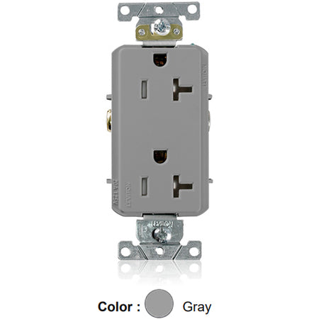 Leviton TDR20-GY, Decora Plus Straight Blade Duplex Receptacle, Heavy-Duty Industrial Specification Grade, Tamper-Resistant, Smooth Face, 20A 125V, NEMA 5-20R, 2-Pole, 3-Wire, Back and Side Wire, Gray
