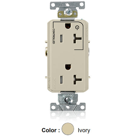 Leviton TDR20-S1I, Decora Plus Straight Blade Duplex Receptacle, Heavy-Duty Industrial Specification Grade, Split-Circuit, One Outlet Marked ''Controlled'', Smooth Face, Tamper-Resistant, 20A 125V, NEMA 5-20R, 2-Pole, 3-Wire, Ivory