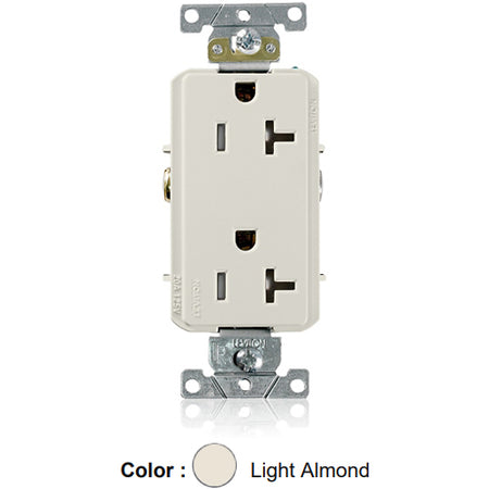 Leviton TDR20-T, Decora Plus Straight Blade Duplex Receptacle, Heavy-Duty Industrial Specification Grade, Tamper-Resistant, Smooth Face, 20A 125V, NEMA 5-20R, 2-Pole, 3-Wire, Back and Side Wire, Light Almond