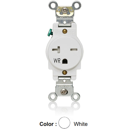 Leviton W5461-T0W, Weather and Tamper-Resistant Standard Straight Blade Single Receptacle, Heavy-Duty Industrial Specification Grade, Smooth Face, 20A 250V, NEMA 6-20R, 2-Pole, 3-Wire, Back and Side Wire, White