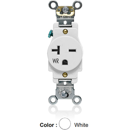Leviton W5461-W, Weather-Resistant Standard Straight Blade Single Receptacle, Heavy-Duty Industrial Specification Grade, Smooth Face, 20A 250V, NEMA 6-20R, 2-Pole, 3-Wire, Back and Side Wire, White