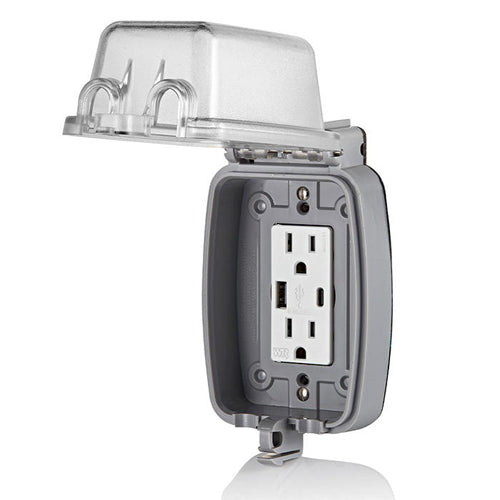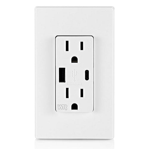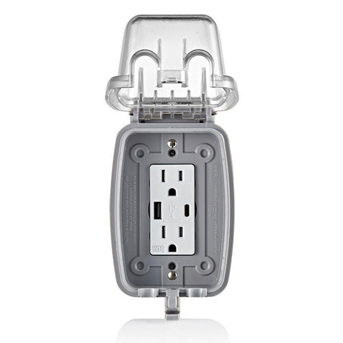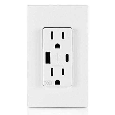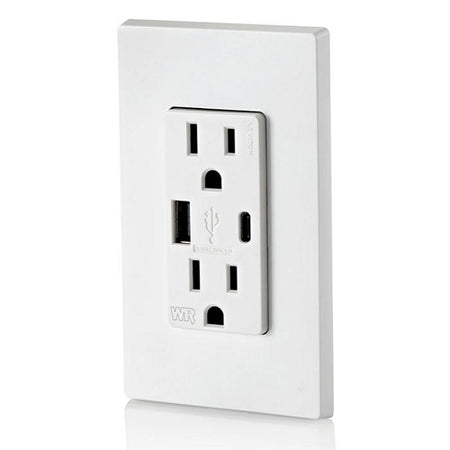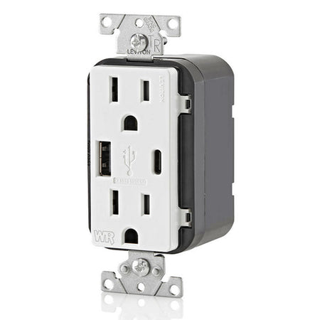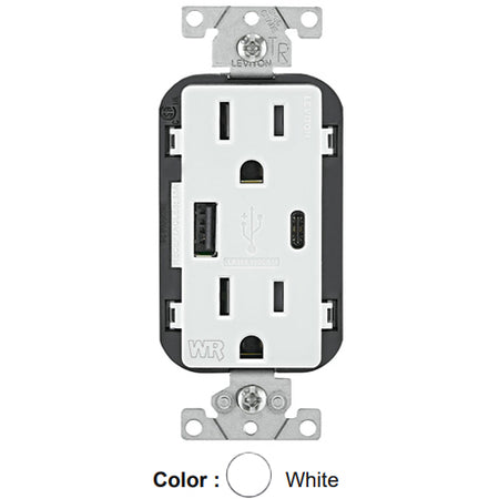 Leviton W5633-W, 25+W (5.1 A) Dual Type A/C USB In-Wall Charger with Duplex Weather-Resistant Receptacle, 15A 125V, Grounding, White