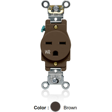 Leviton W5661, Weather-Resistant Standard Straight Blade Single Receptacle, Heavy-Duty Industrial Specification Grade, Smooth Face, 15A 250V, NEMA 6-15R, 2-Pole, 3-Wire, Back and Side Wire, Brown
