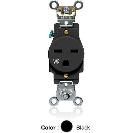 Leviton W5661-E, Weather-Resistant Standard Straight Blade Single Receptacle, Heavy-Duty Industrial Specification Grade, Smooth Face, 15A 250V, NEMA 6-15R, 2-Pole, 3-Wire, Back and Side Wire, Black