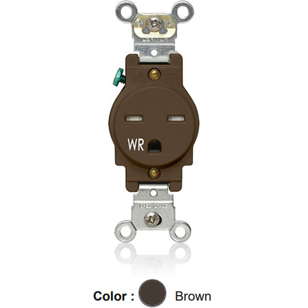 Leviton W5661-T00, Weather and Tamper-Resistant Standard Straight Blade Single Receptacle, Heavy-Duty Industrial Specification Grade, Smooth Face, 15A 250V, NEMA 6-15R, 2-Pole, 3-Wire, Back and Side Wire, Brown
