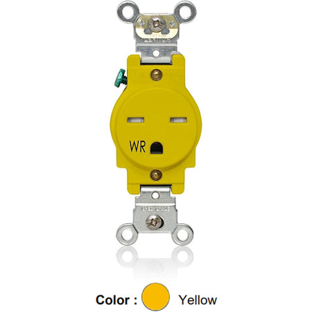 Leviton W5661-T0Y, Weather and Tamper-Resistant Standard Straight Blade Single Receptacle, Heavy-Duty Industrial Specification Grade, Smooth Face, 15A 250V, NEMA 6-15R, 2-Pole, 3-Wire, Back and Side Wire, Yellow