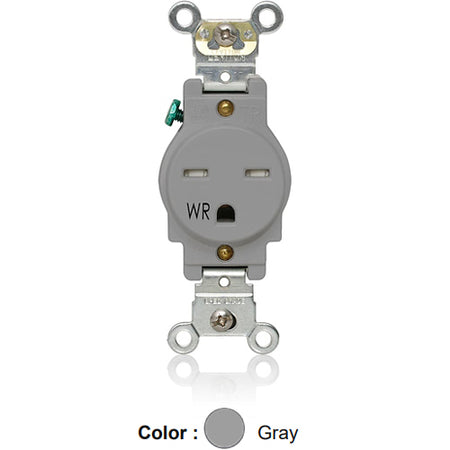 Leviton W5661-TGY, Weather and Tamper-Resistant Standard Straight Blade Single Receptacle, Heavy-Duty Industrial Specification Grade, Smooth Face, 15A 250V, NEMA 6-15R, 2-Pole, 3-Wire, Back and Side Wire, Gray