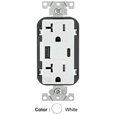 Leviton W5833-W, 25+W (5.1 A) Dual Type A/C USB In-Wall Charger with Duplex Weather-Resistant Receptacle, 20A 125V, Grounding, White