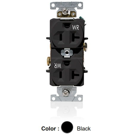 Leviton WBR20-E, Weather-Resistant Standard Straight Blade Duplex Receptacle, Heavy-Duty Industrial Specification Grade, Indented Face, 20A 125V, NEMA 5-20R, 2-Pole, 3-Wire, Self-Grounding, Back and Side Wire, Black