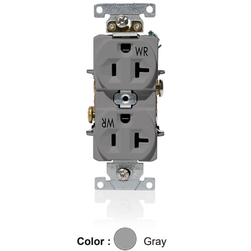 Leviton WBR20-GY, Weather-Resistant Standard Straight Blade Duplex Receptacle, Heavy-Duty Industrial Specification Grade, Indented Face, 20A 125V, NEMA 5-20R, 2-Pole, 3-Wire, Self-Grounding, Back and Side Wire, Gray