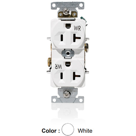 Leviton WBR20-W, Weather-Resistant Standard Straight Blade Duplex Receptacle, Heavy-Duty Industrial Specification Grade, Indented Face, 20A 125V, NEMA 5-20R, 2-Pole, 3-Wire, Self-Grounding, Back and Side Wire, White