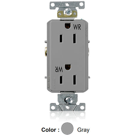 Leviton WDR15-GY, Decora Plus Straight Blade Duplex Receptacle, Heavy-Duty Industrial Specification Grade, Weather-Resistant, Smooth Face, 15A 125V, NEMA 5-15R, 2-Pole, 3-Wire, Back and Side Wire, Gray