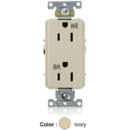 Leviton WDR15-I, Decora Plus Straight Blade Duplex Receptacle, Heavy-Duty Industrial Specification Grade, Weather-Resistant, Smooth Face, 15A 125V, NEMA 5-15R, 2-Pole, 3-Wire, Back and Side Wire, Ivory