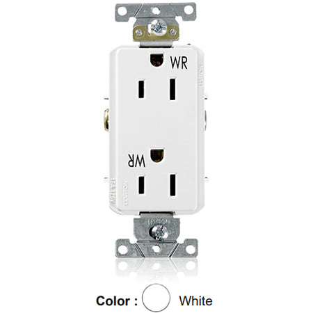 Leviton WDR15-W, Decora Plus Straight Blade Duplex Receptacle, Heavy-Duty Industrial Specification Grade, Weather-Resistant, Smooth Face, 15A 125V, NEMA 5-15R, 2-Pole, 3-Wire, Back and Side Wire, White