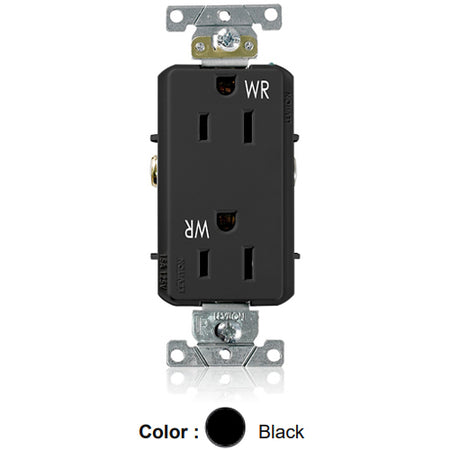Leviton WTD15-E, Decora Plus Straight Blade Duplex Receptacle, Heavy-Duty Industrial Specification Grade, Weather and Tamper-Resistant, Smooth Face, 15A 125V, NEMA 5-15R, 2-Pole, 3-Wire, Back and Side Wire, Black