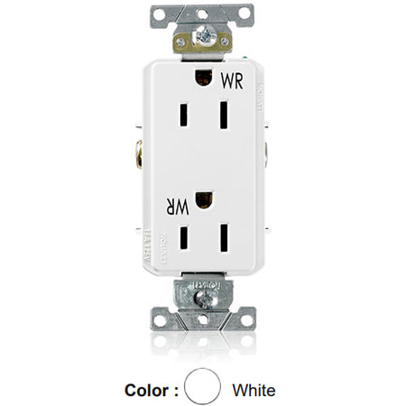 Leviton WTD15-W, Decora Plus Straight Blade Duplex Receptacle, Heavy-Duty Industrial Specification Grade, Weather and Tamper-Resistant, Smooth Face, 15A 125V, NEMA 5-15R, 2-Pole, 3-Wire, Back and Side Wire, White
