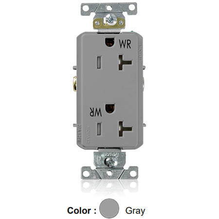 Leviton WTD20-GY, Decora Plus Straight Blade Duplex Receptacle, Heavy-Duty Industrial Specification Grade, Weather and Tamper-Resistant, Smooth Face, 20A 125V, NEMA 5-20R, 2-Pole, 3-Wire, Back and Side Wire, Gray