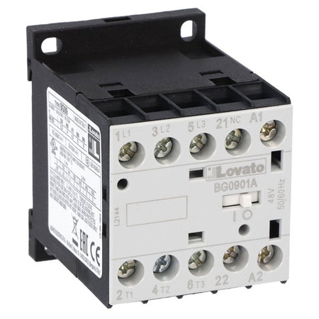 Lovato 11BG0901A02460, Three-Pole BG Series Mini Contactor, IEC Operating Current Ie (AC3) = 9A, AC Coil 60Hz, 24VAC, 1NC Auxiliary Contact